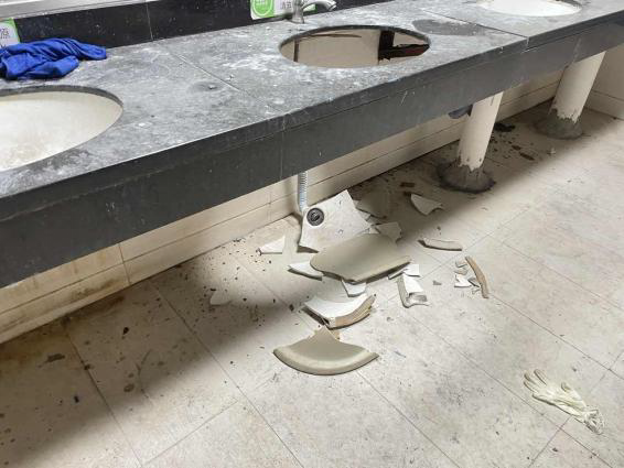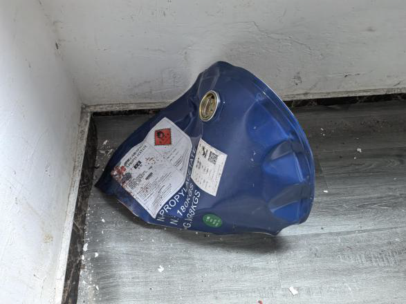 包装桶坐落洗手间洗手台正前方,洗手台第3个洗手盆破碎损坏,包装桶桶底凸出,桶身上部变形,顶盖部分凸出折弯变形,部分已脱离桶身飞出,顶盖飞出部分外表贴有“醋酸正丙酯”“易燃液体”安全标签,符号显现桶内原物料毛重180千克。
